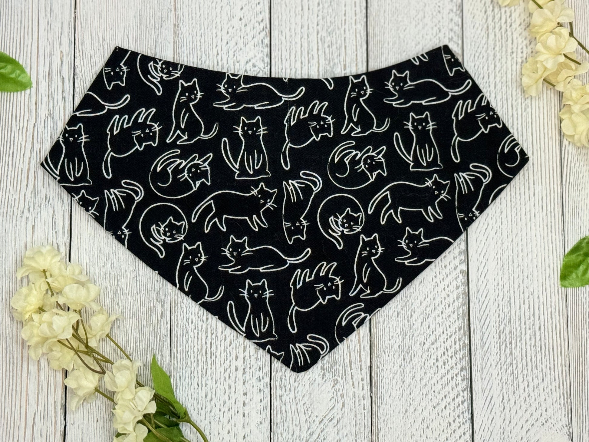 Unleash your creative side with Doodle Cat! This handmade dog bandana features playful doodles of black cats on soft cotton fabric. Your furry friend will look meow-tastic and cute while wearing this quirky accessory. (Get ready for an abundance of compliments and purr-fect photos with your furry friend!)