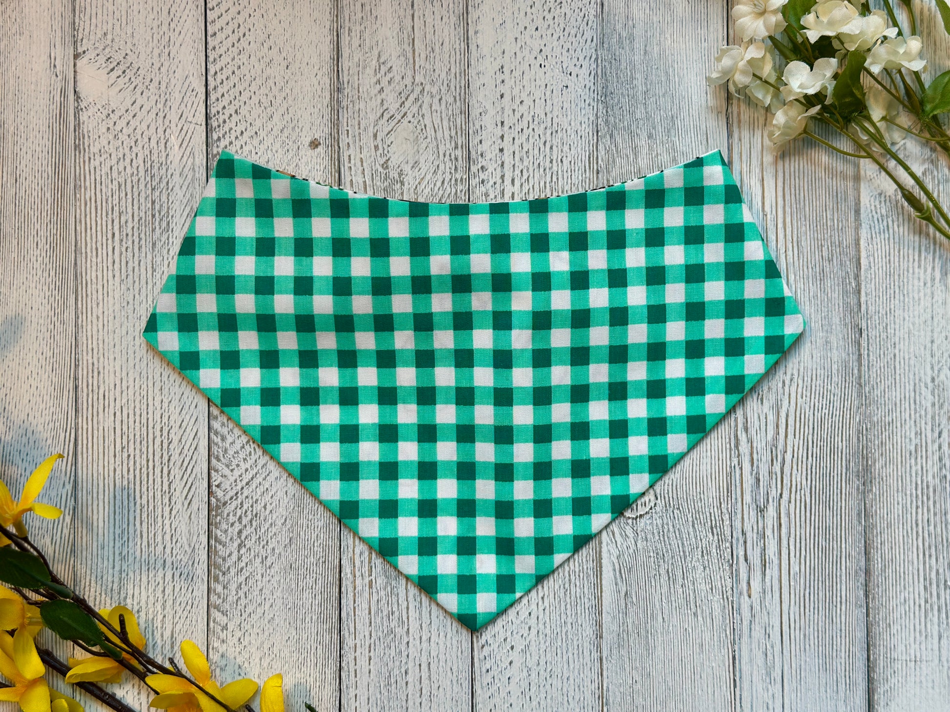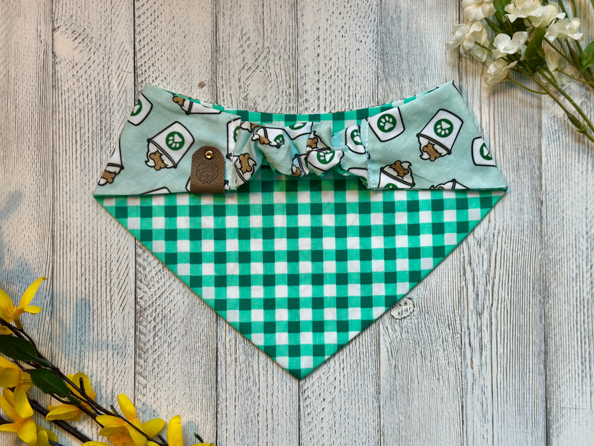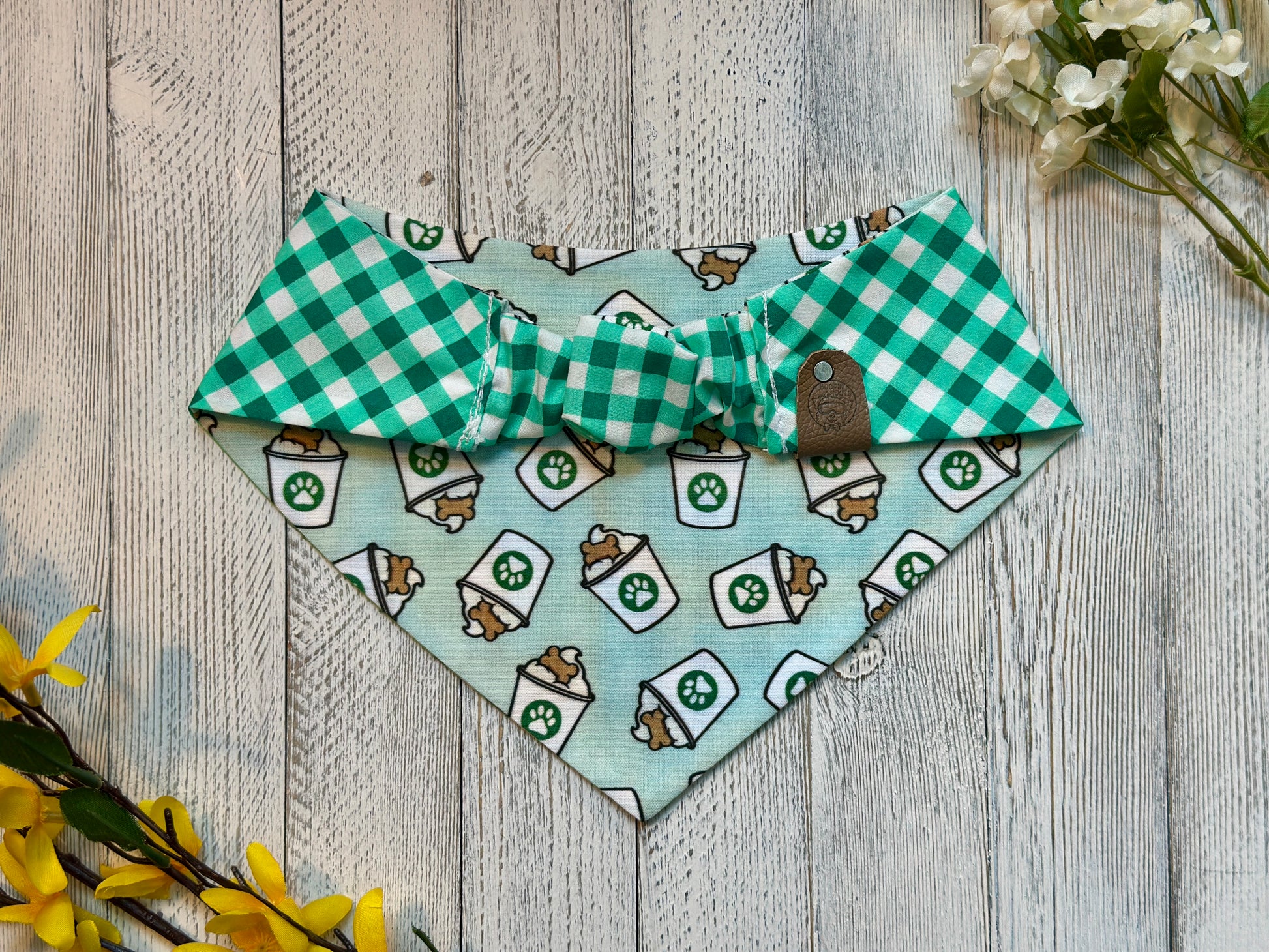 Dress your pup in style with the Barkuccino reversible pet bandana! Featuring a fun green pup cup design on one side and a green gingham pattern on the other. this bandana adds a splash of playful charm to any doggy outfit. Perfect for cozy strolls or special occasions, it’s an easy way to show off your pet’s personality with flair. Comfortable and lightweight, the reversible design lets you switch up their look in seconds. Double the fun for your furry friend!
