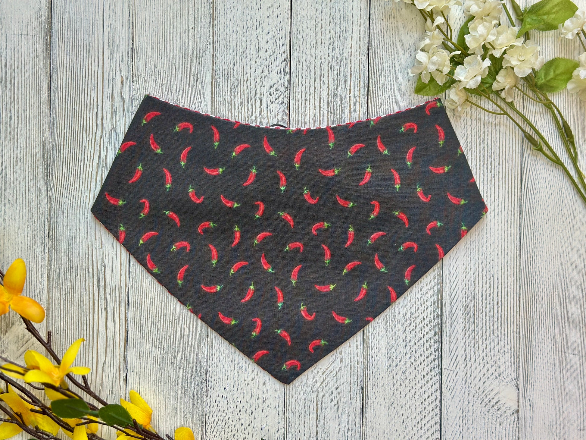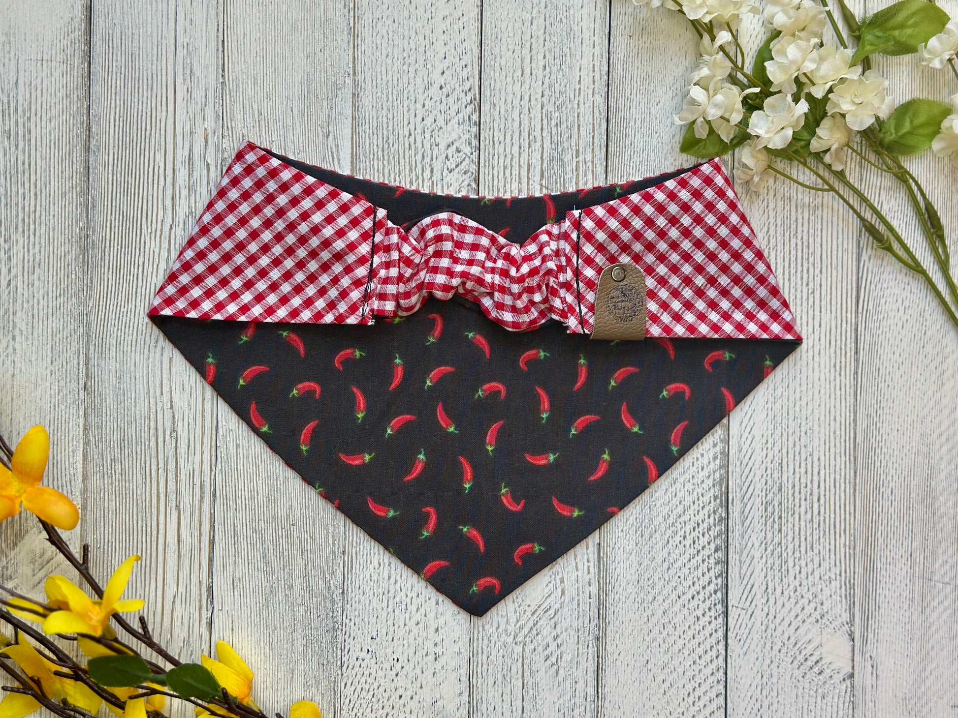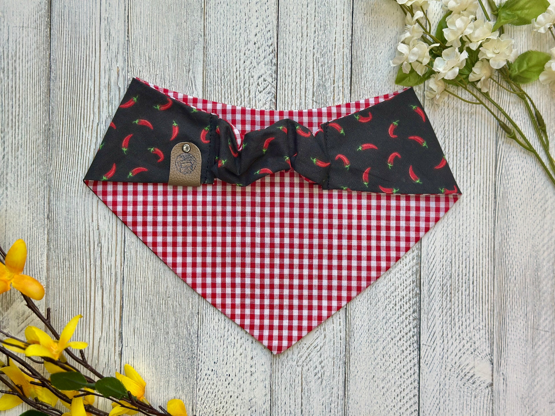 Bring the heat with the Fresno Flame reversible pet bandana! Featuring a spicy pattern of small red peppers on one side and cheerful red gingham on the other, it’s the perfect accessory for pets ready to turn up their style. Two fun looks in one bandana!