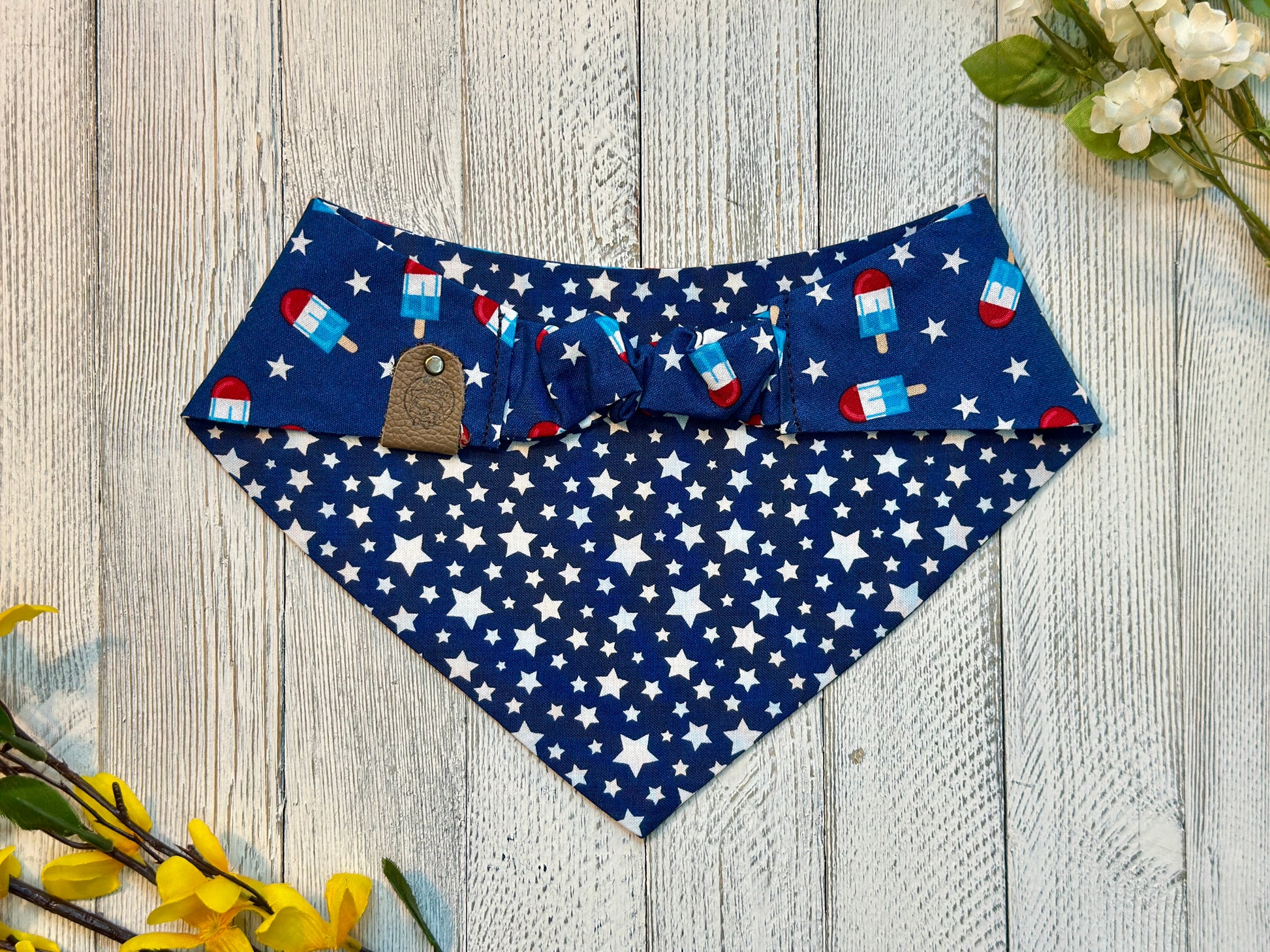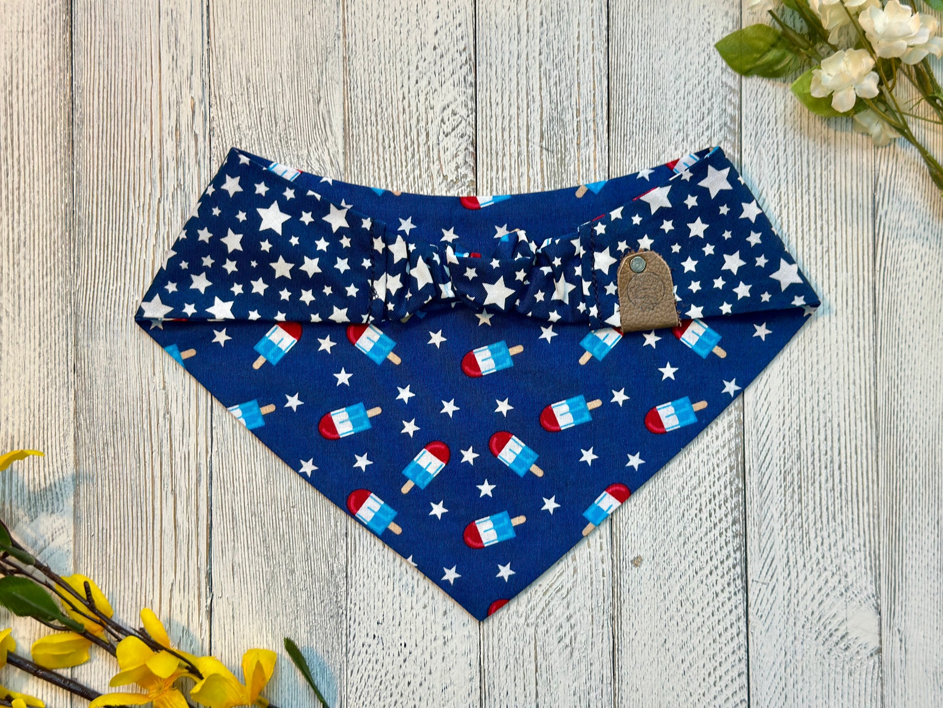 Celebrate your pet’s patriotic spirit with the Bomb Pop bandana! Featuring vibrant red, white, and blue colors along with star and bomb pop designs, this playful accessory adds a festive touch to any occasion. Perfect for summer fun or holiday gatherings, it’s a cheerful way to show off your pet’s star-spangled style.
