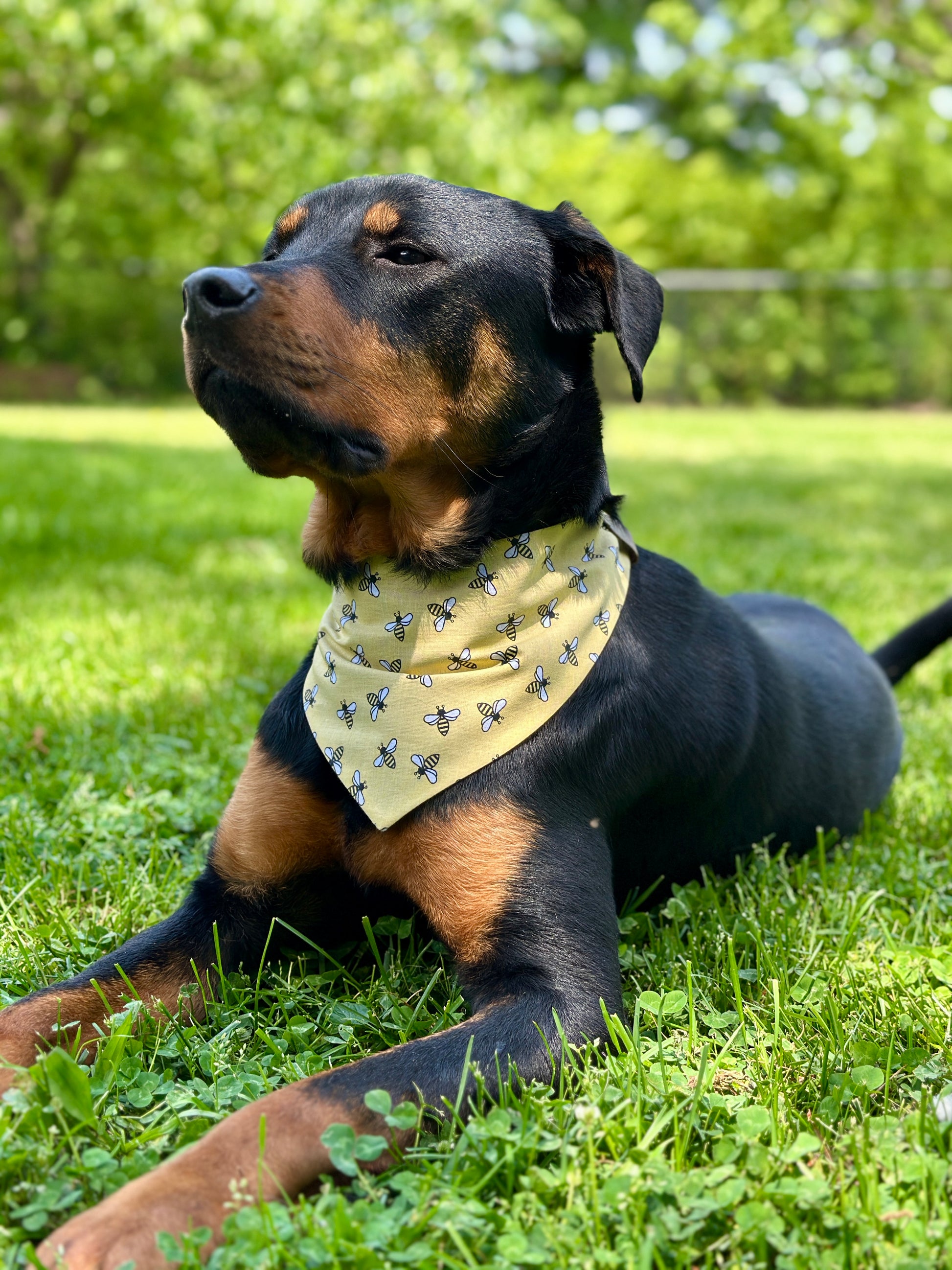 No need to buzz about it, the Honey Bee slip-on pet bandana is here to add some springtime fun to your furry friend's wardrobe! With no tying, snapping, or attaching to a collar required, this cute bandana is perfect for those busy bees on the go. Get ready to turn heads and make the whole neighborhood buzz with envy!