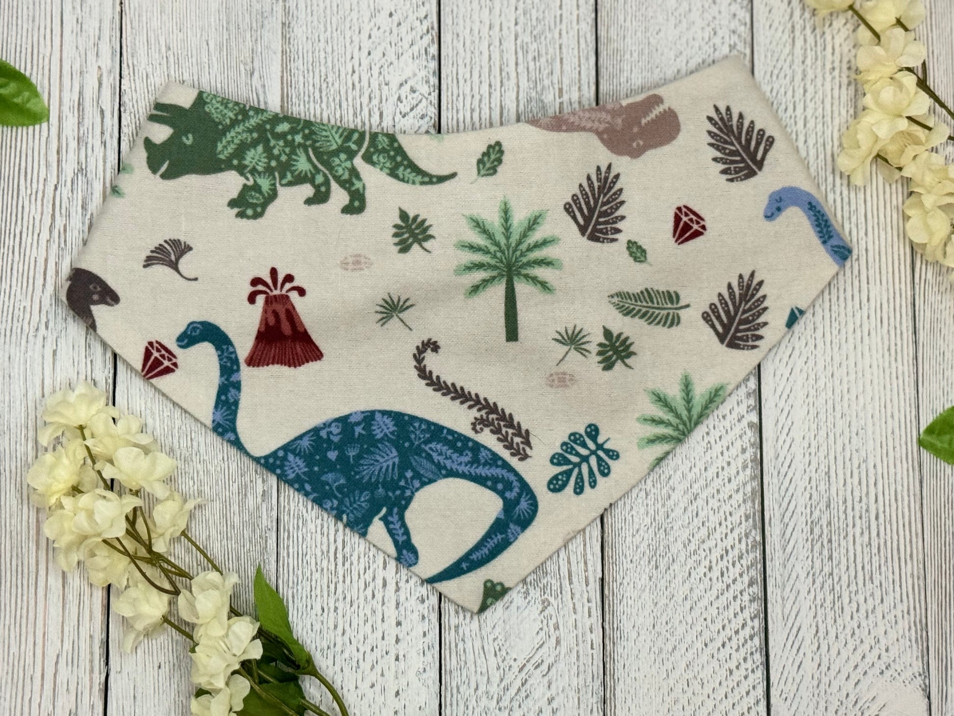 Unleash your dog's inner adventurer with our Colossal Fossils bandana! Handmade with ancient dinosaur and gemstone designs on cozy flannel fabric, it's perfect for chilly winter walks. Each one is unique, just like your fearless pup. Get ready for a roaring good time!