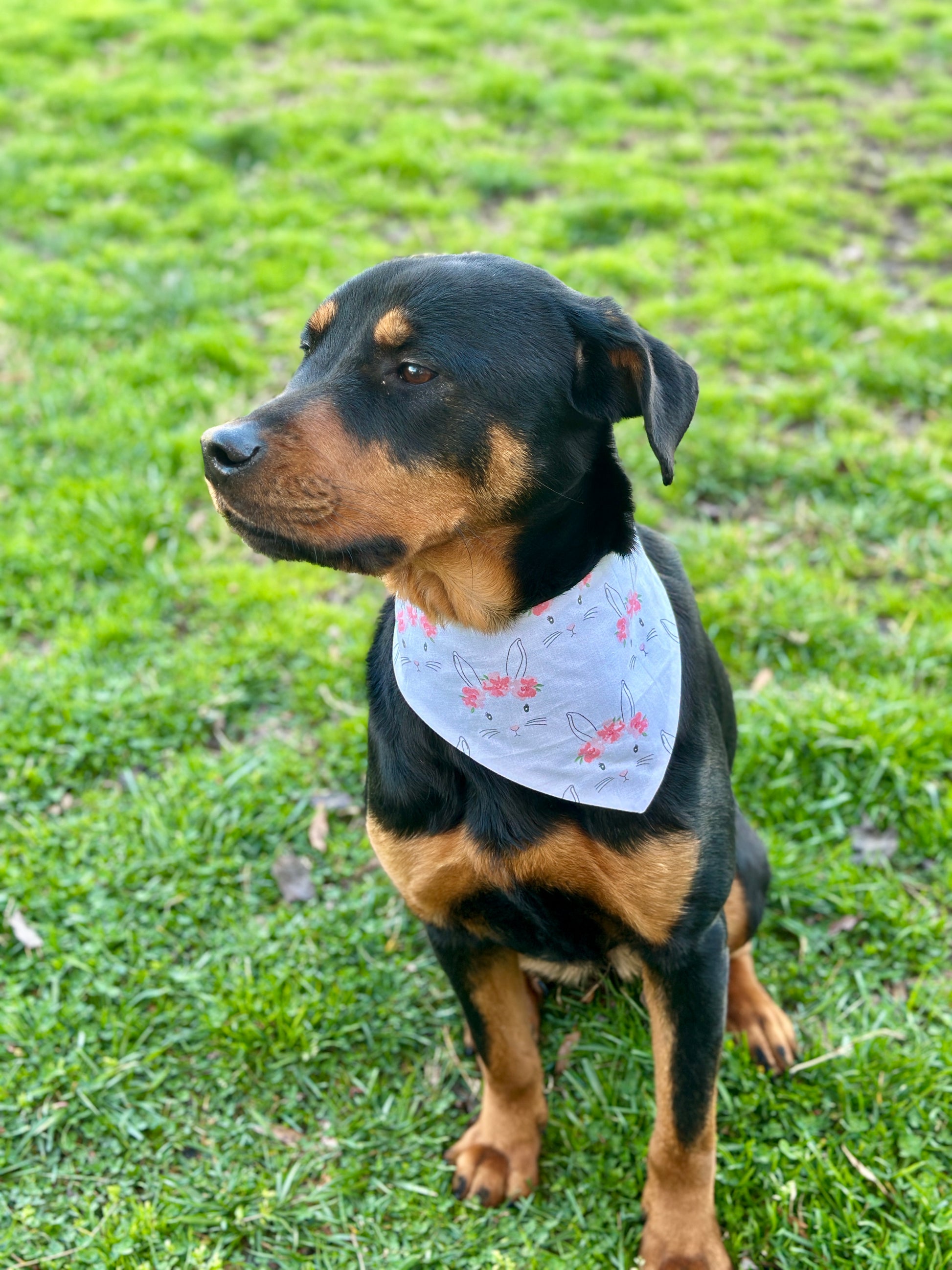 Pictured: Denali (55 lbs.) wearing a medium bandana