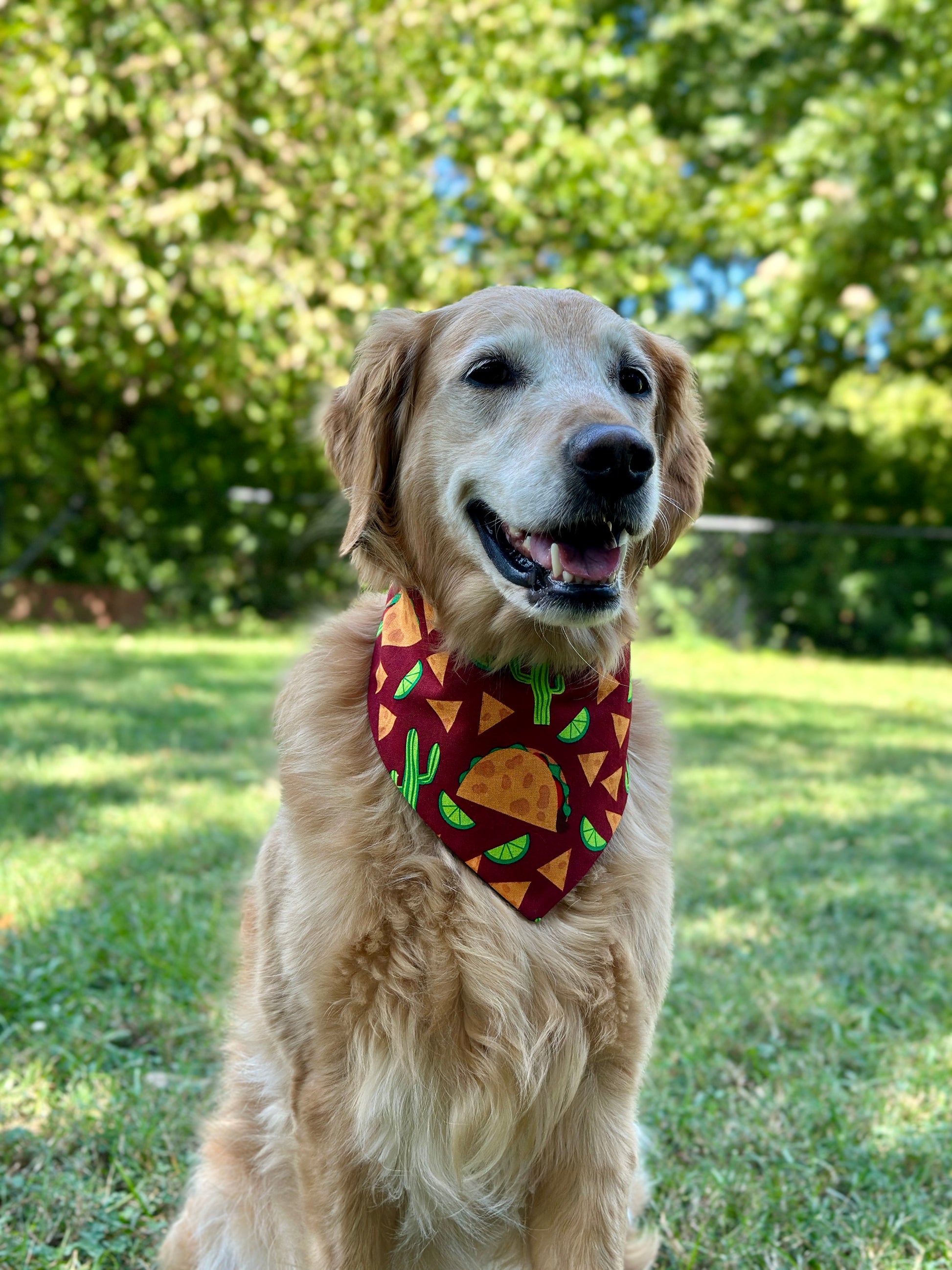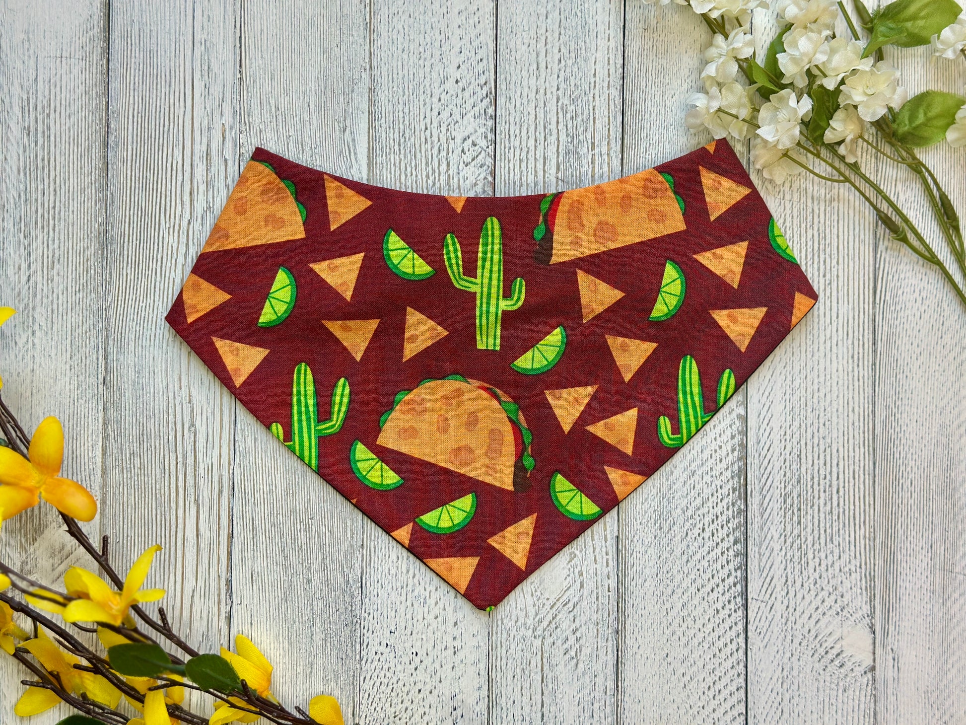 Bring a fiesta to your pet’s wardrobe with the Tacos N' Lime bandana! Covered in colorful tacos, crunchy tortilla chips, bright limes, and a cheerful cactus, this playful accessory adds a splash of fun and flavor to any furry friend’s day. Perfect for pets who like to stand out with a tasty twist!