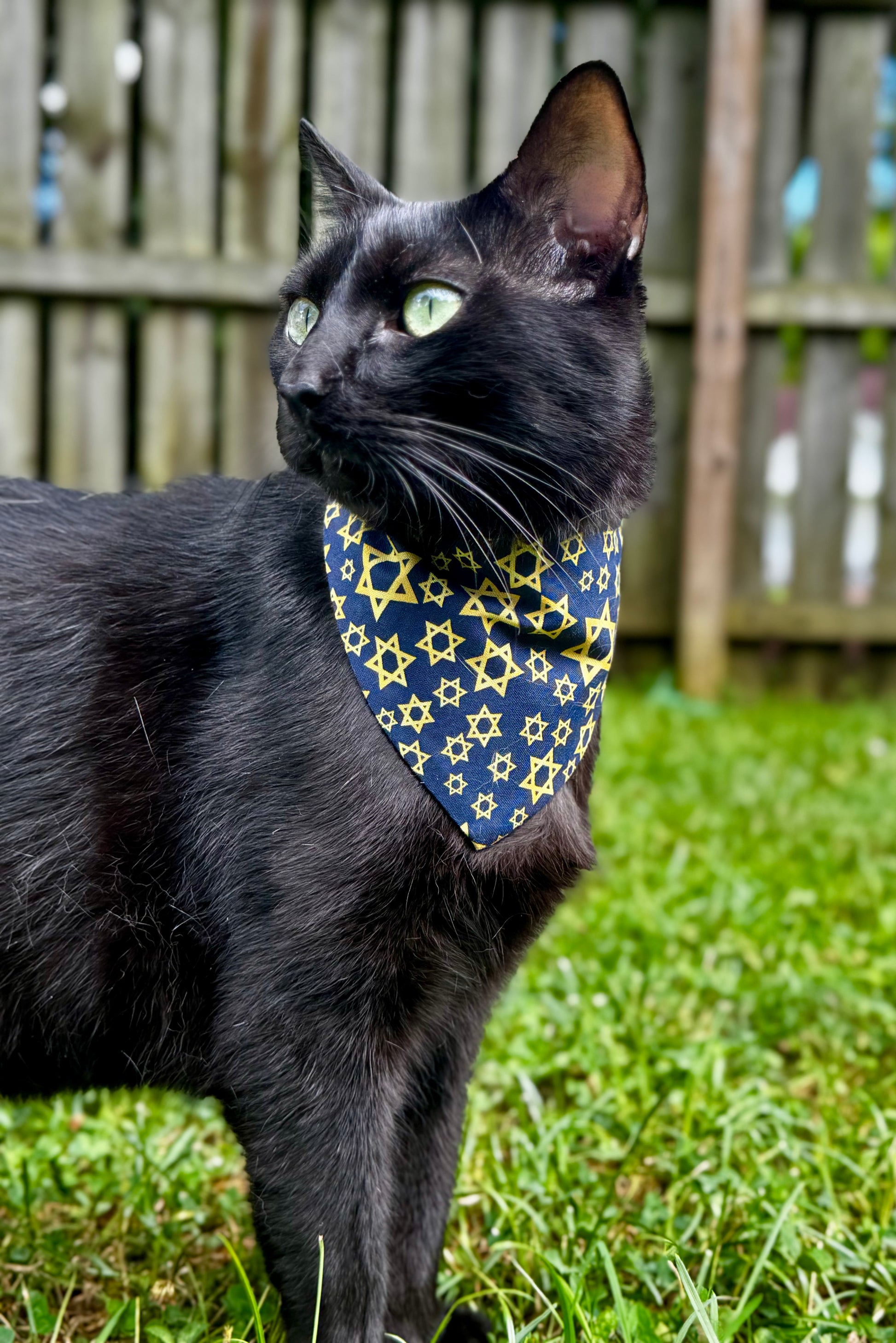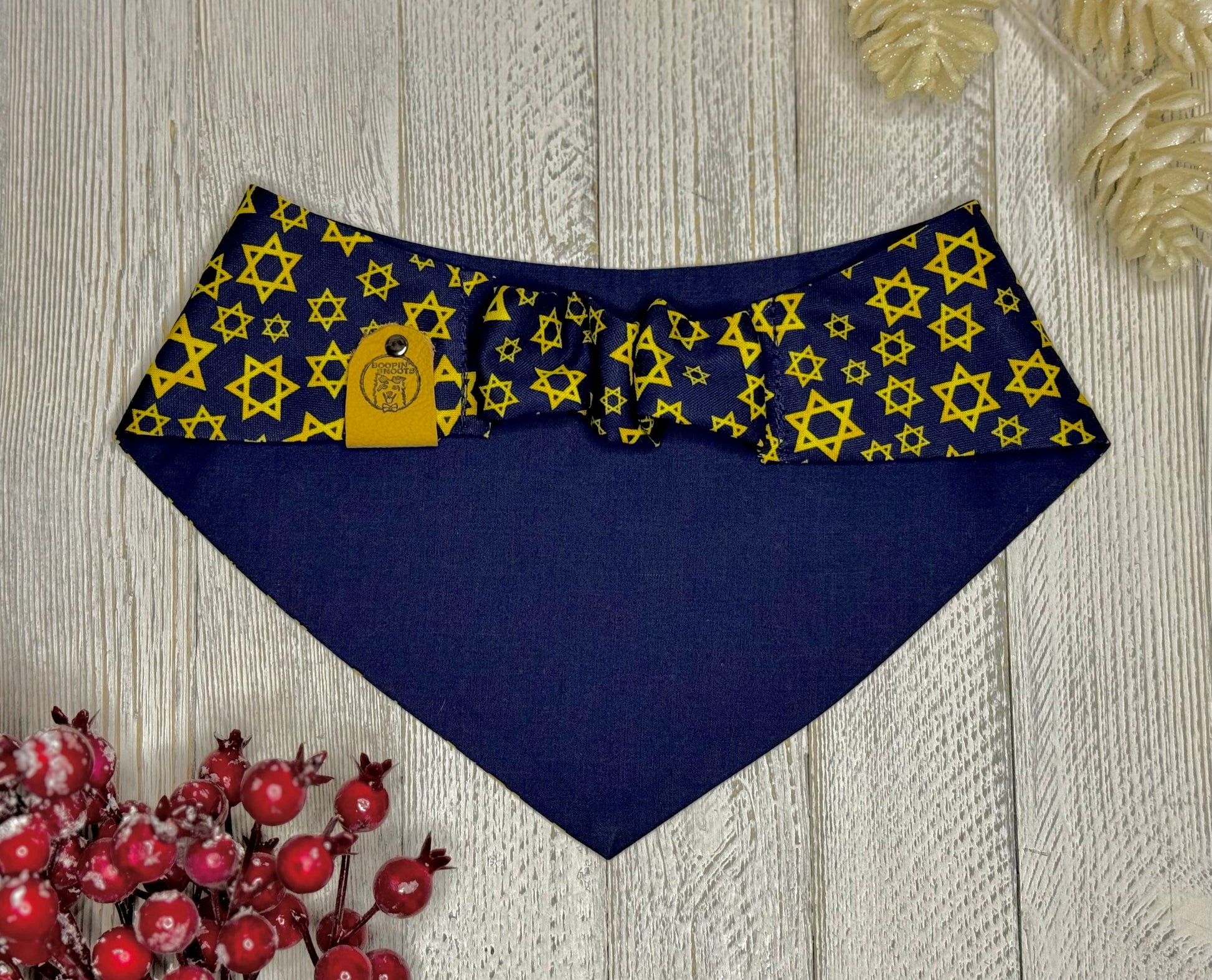 Dress your furry friend in holiday spirit with our Happy Hanukkah Pet Bandana. Crafted from soft cotton fabric, this scrunchie bandana adds a touch of luxury to your pet's festive attire. Celebrate the season in style with this exclusive accessory.