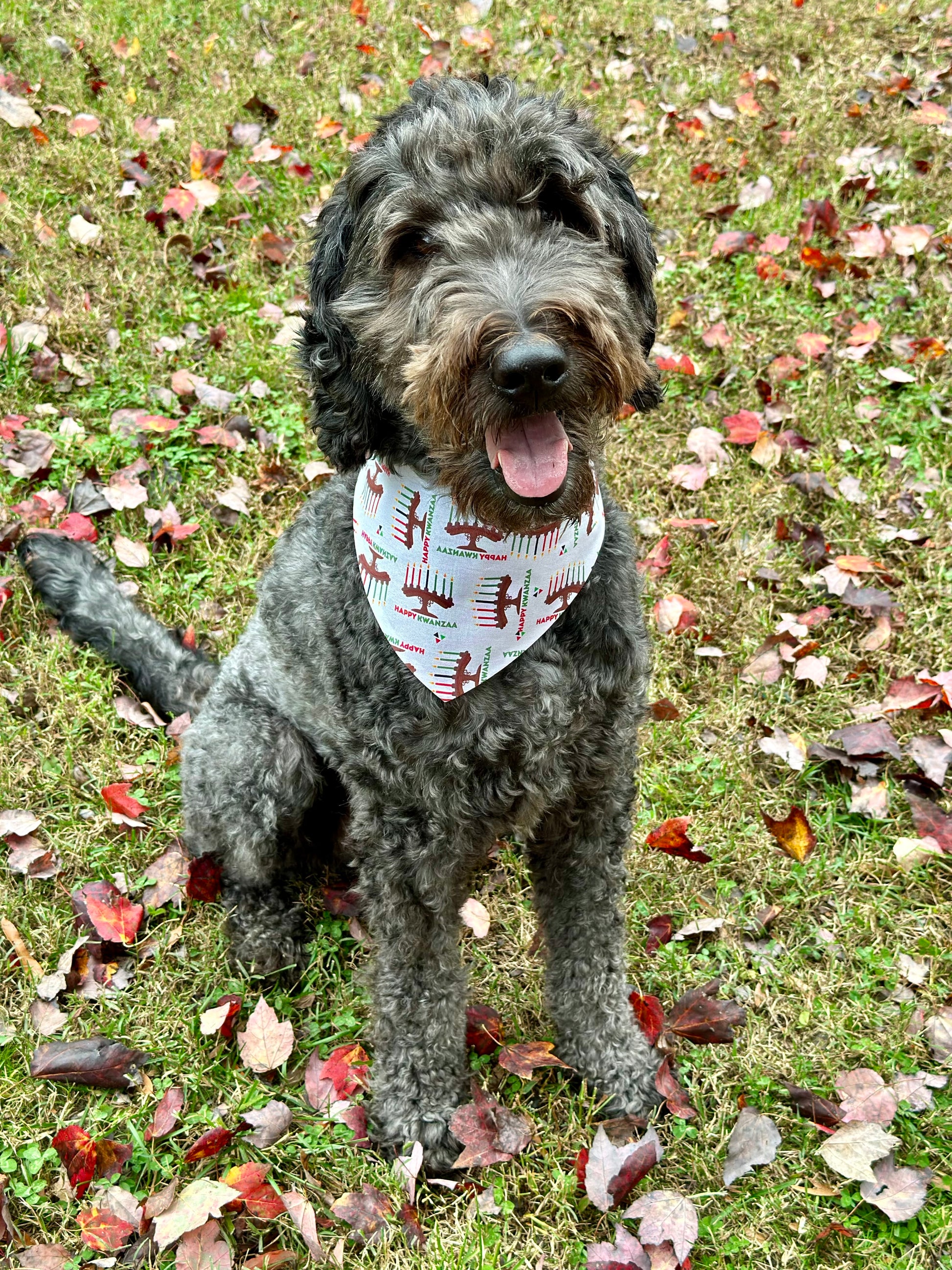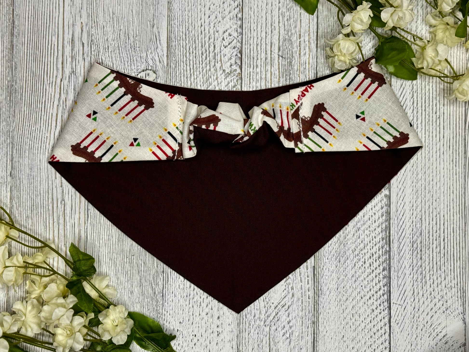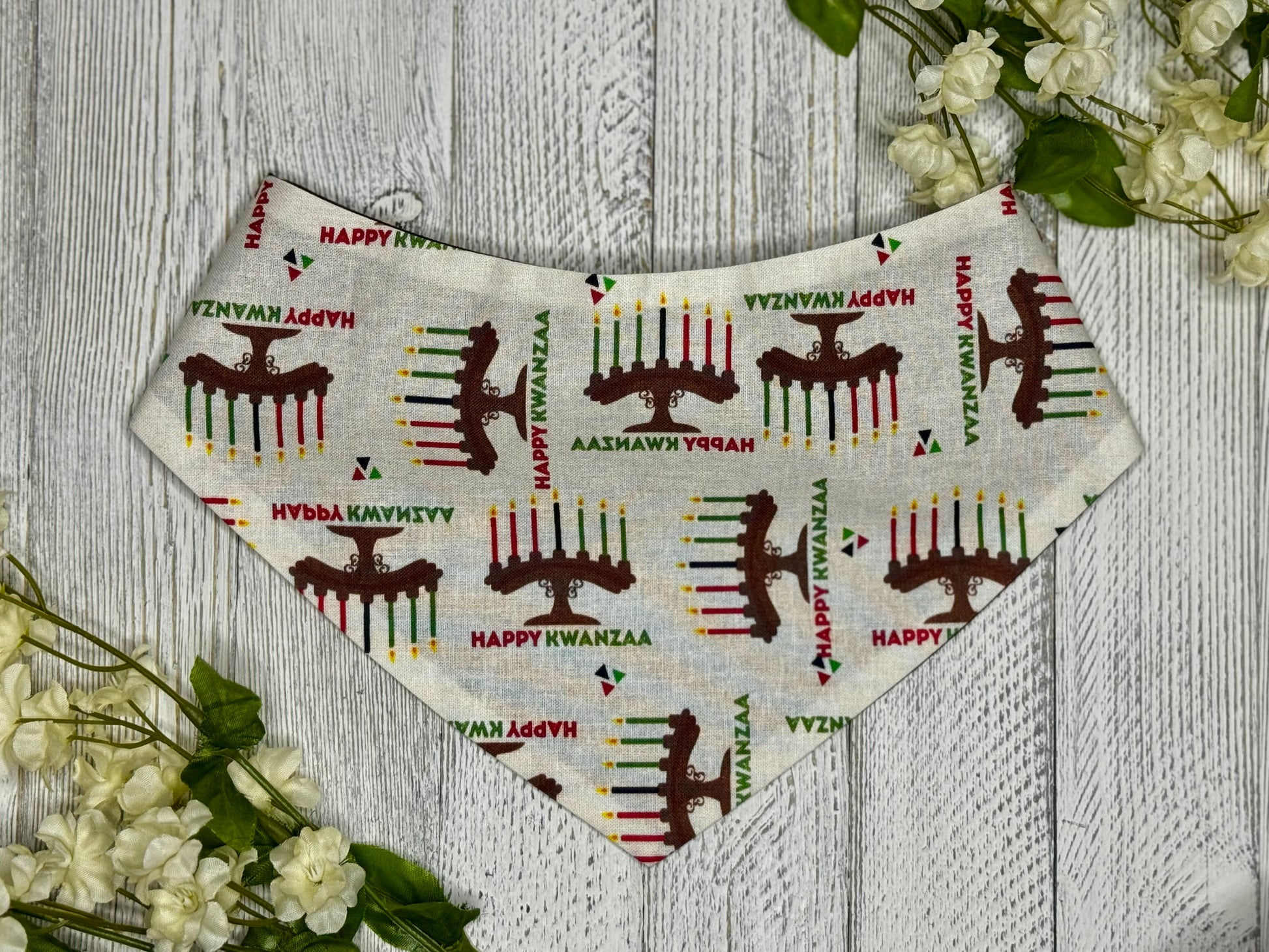 Get your furry friend in the holiday spirit with our Happy Kwanzaa pet bandana! Made from cute and comfy cotton fabric, this scrunchie bandana is the perfect way to celebrate the season. Show off your festive side and make your pet the life of the party. Happy Kwanzaa!