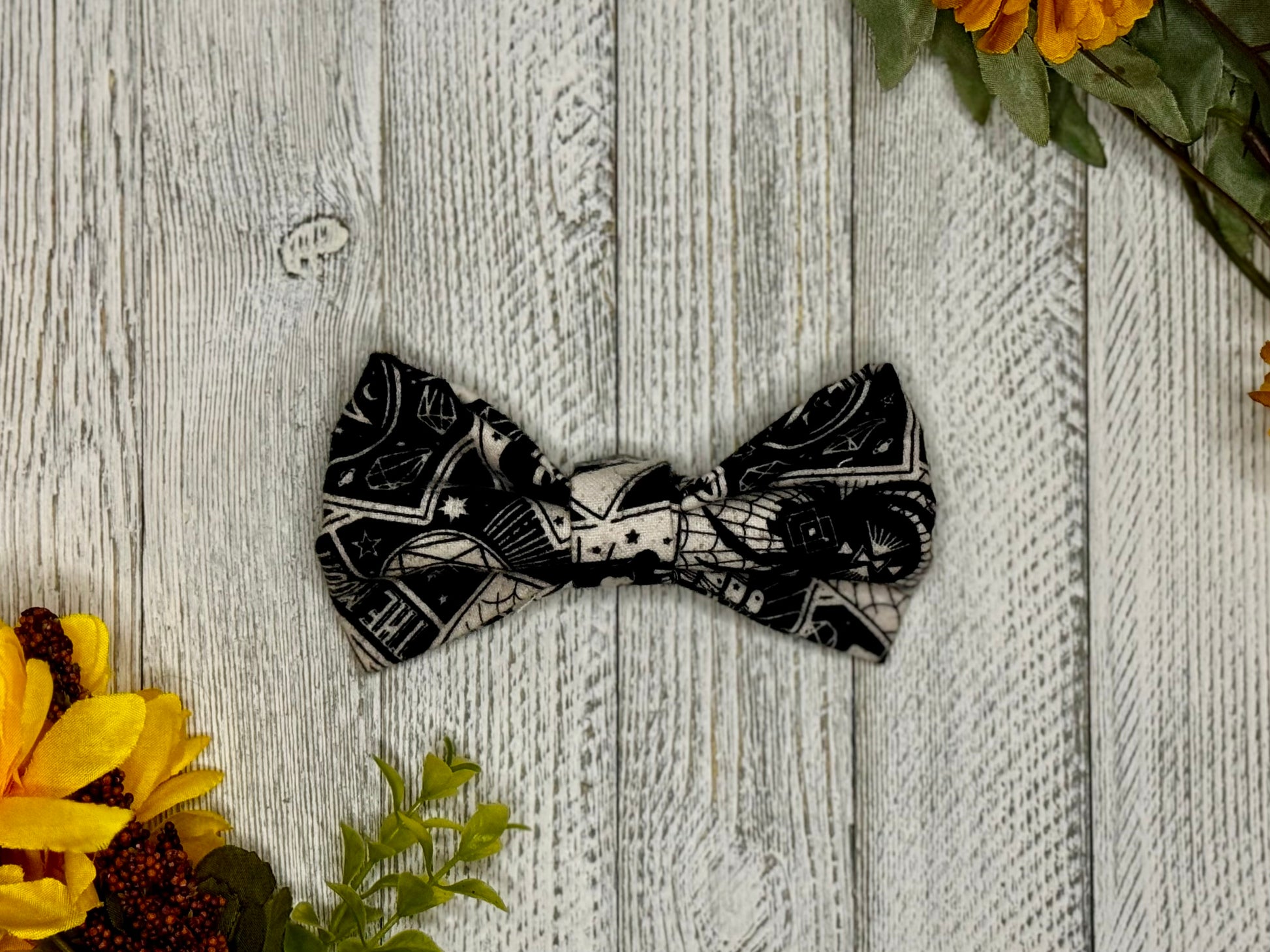 Unleash your inner fortune-teller with the Mystic Mutt Reading Clip-on Bow Tie. Easy to clip onto hair or clothing, this bow tie features mesmerizing tarot cards that guarantee a fabulous look. Take a chance and make a statement with this one-of-a-kind accessory! Wearable by pet and human alike!