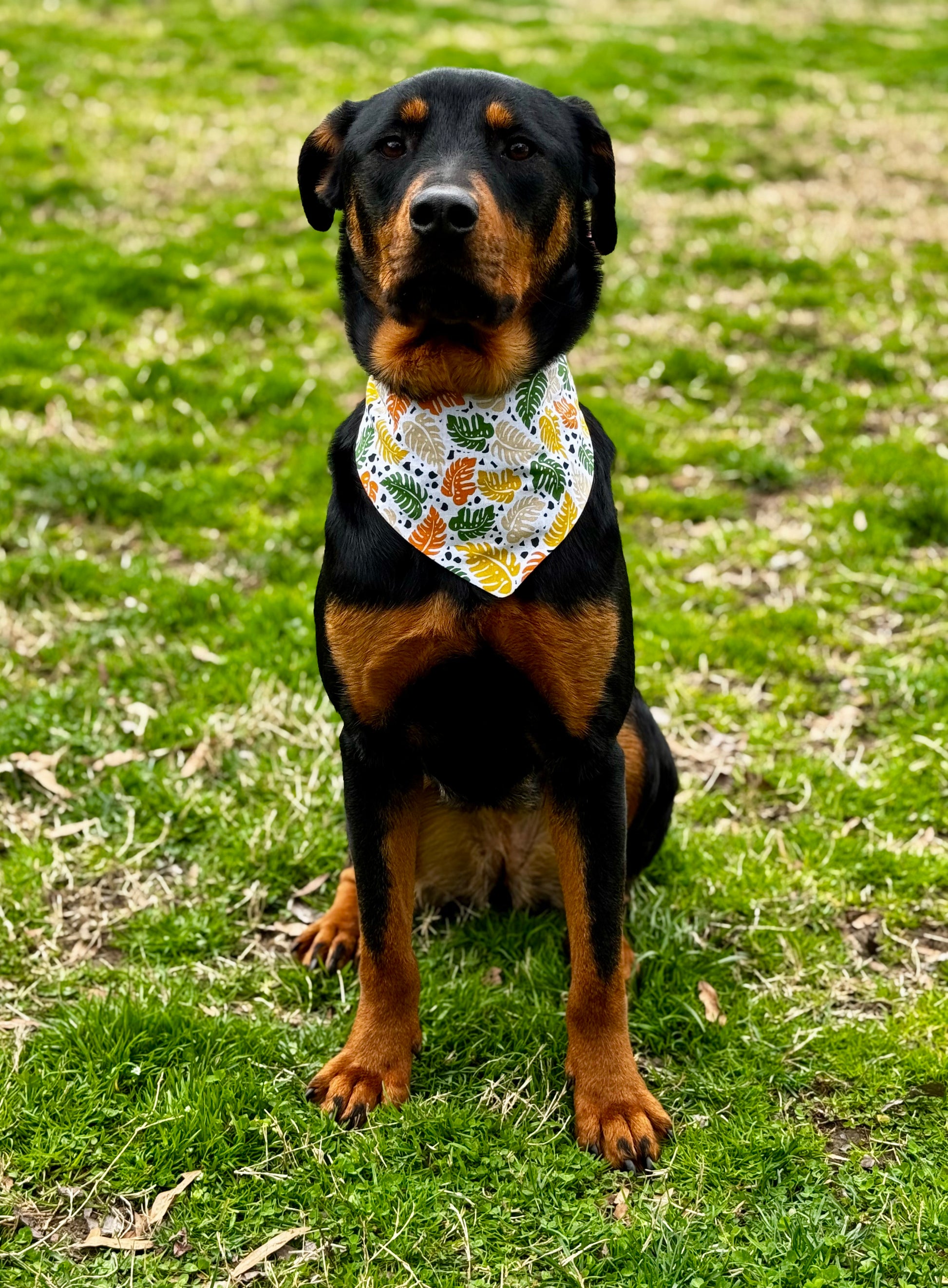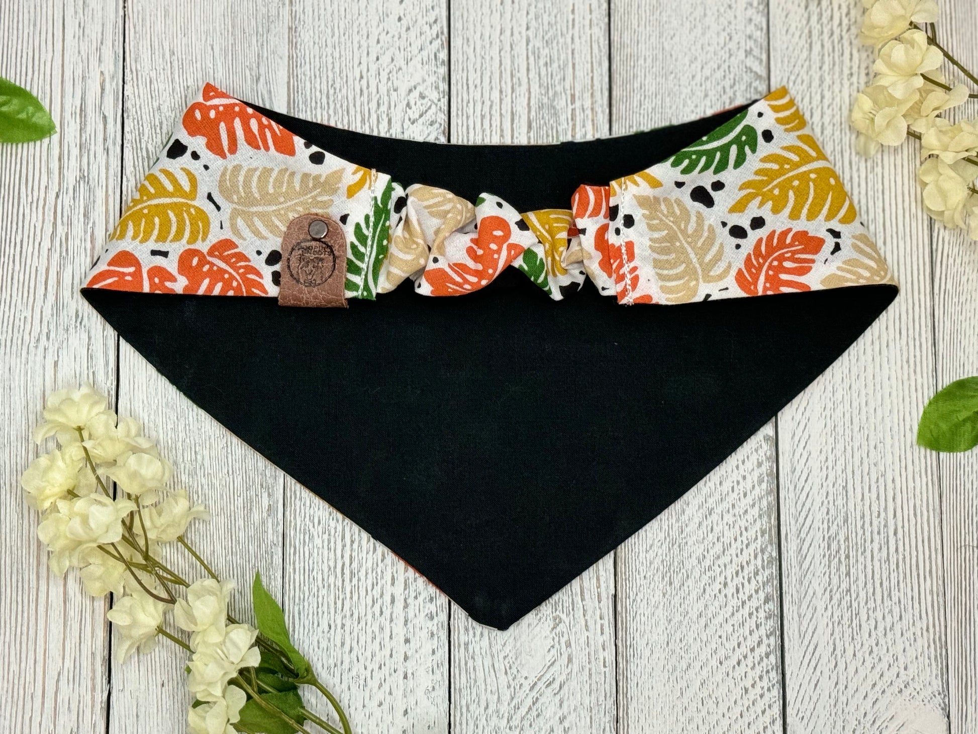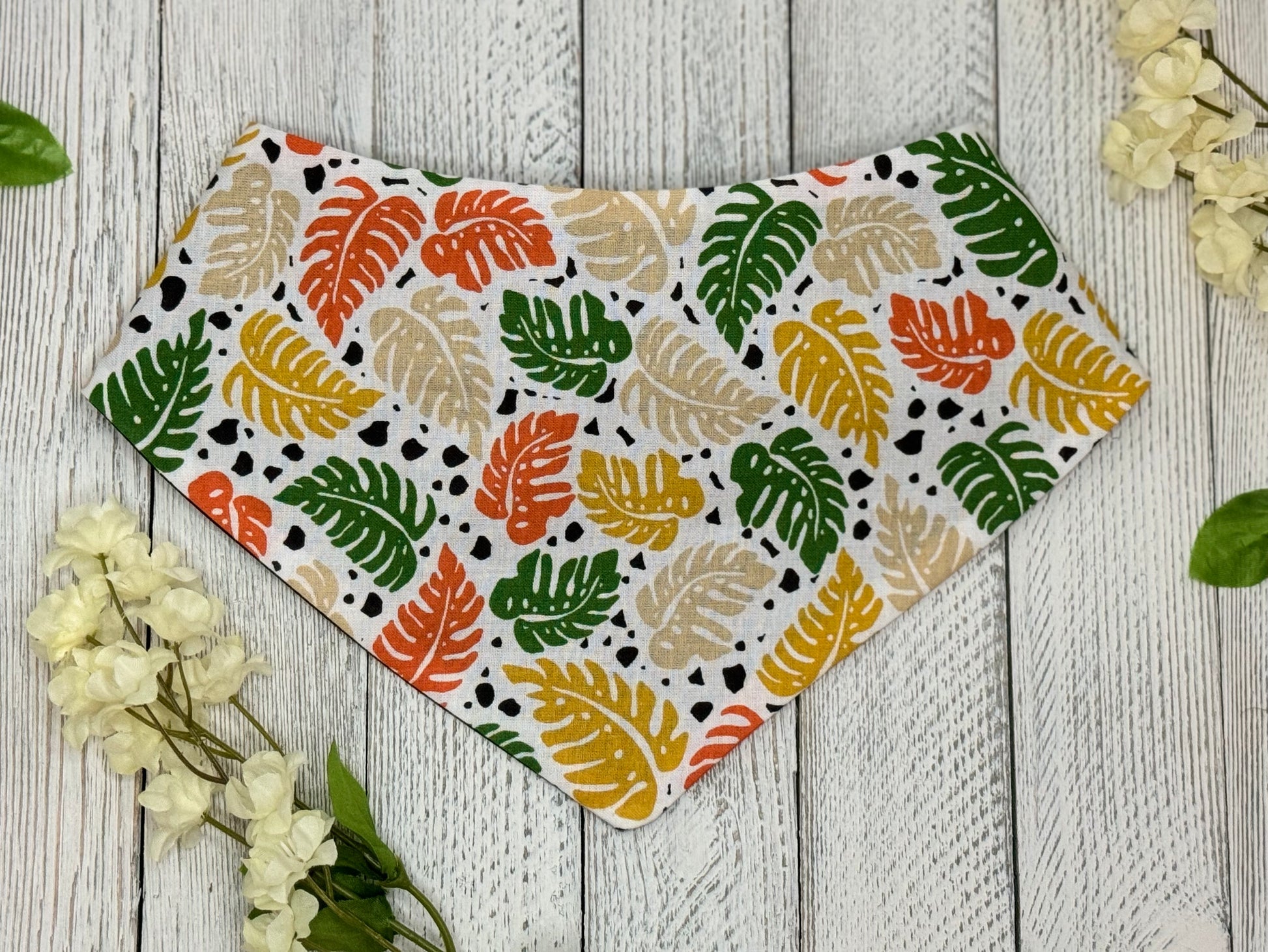 Transport your furry friend into the jungle with our handmade pet bandana! Perfect for the adventurous pup, this scrunchie bandana features multicolored giant leaves that will make them stand out on any outdoor excursion. Let your pet's wild side shine!