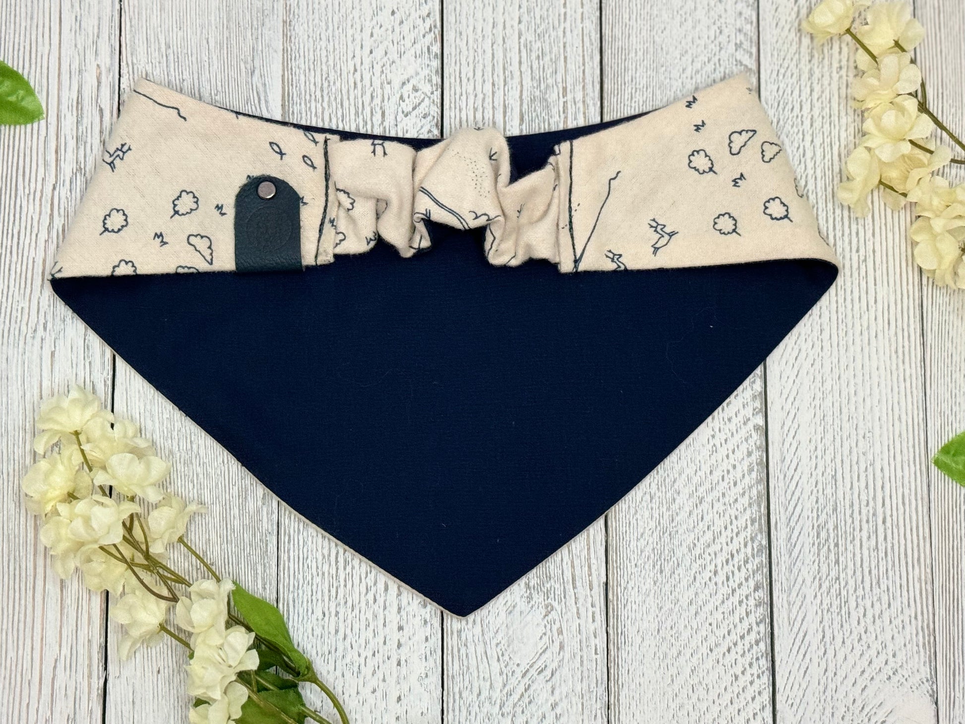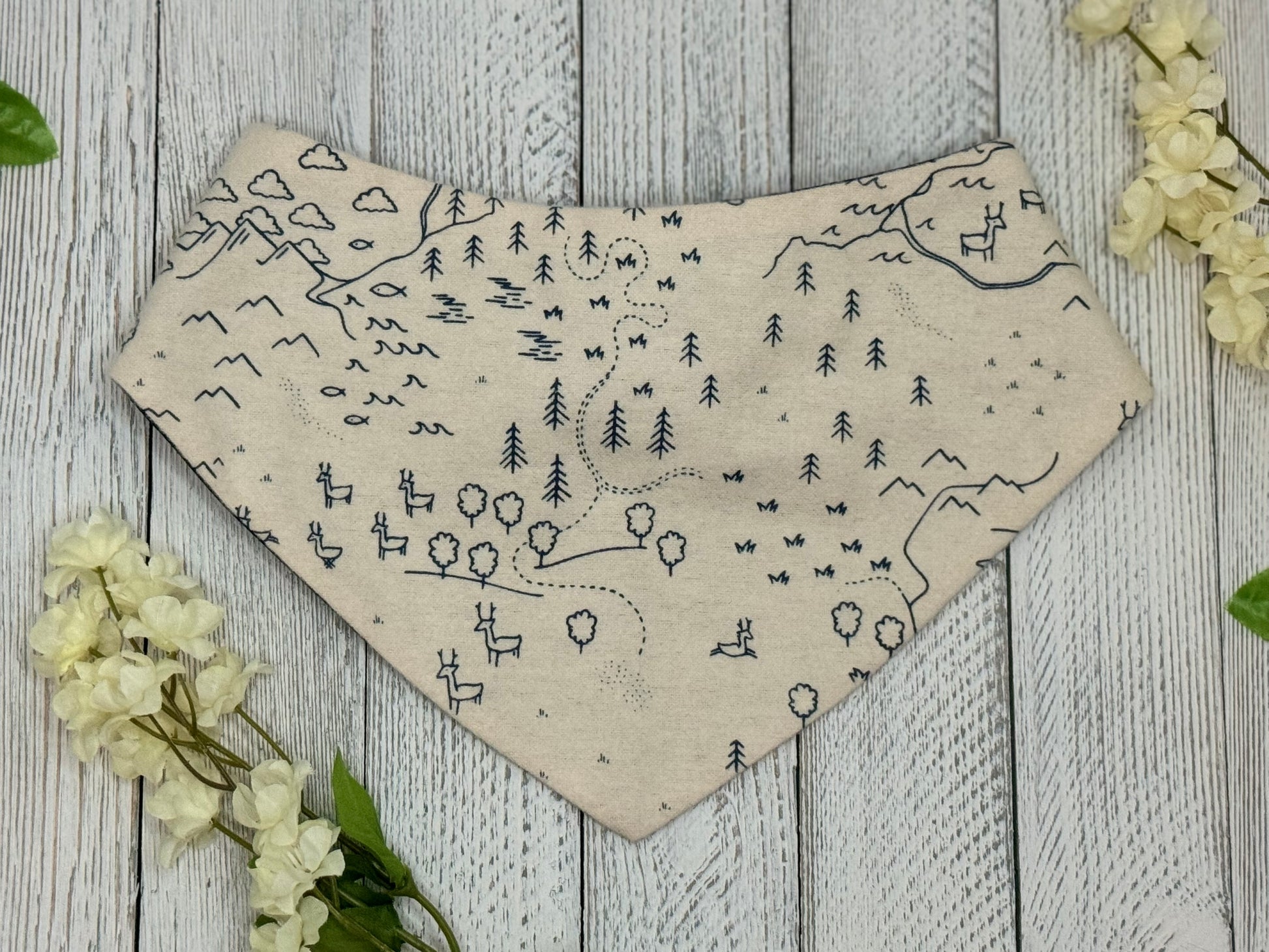 Embrace your inner explorer with our handmade Lil' Explorer pet bandana. Made with soft flannel material, this bandana features a whimsical map, deer, and landscape design that will have your furry friend ready to explore the great outdoors. Let your pup's adventurous spirit shine with this exclusive accessory.