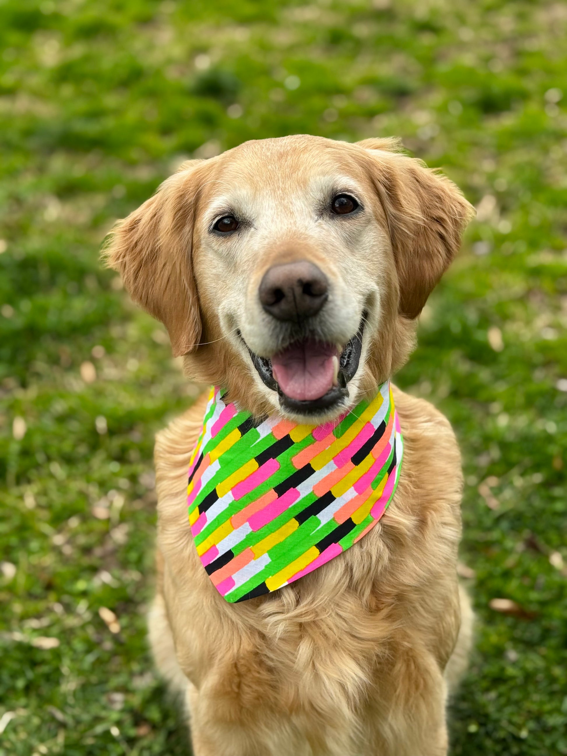 Elevate your pet's style with our Neon Ice Bandana! This scrunchie-style bandana features double-sided designs of cute popsicles on one side and neon stripes on the other. Perfect for standing out this summer and keeping your furry friend cool. Get ready to have the coolest pet on the block!