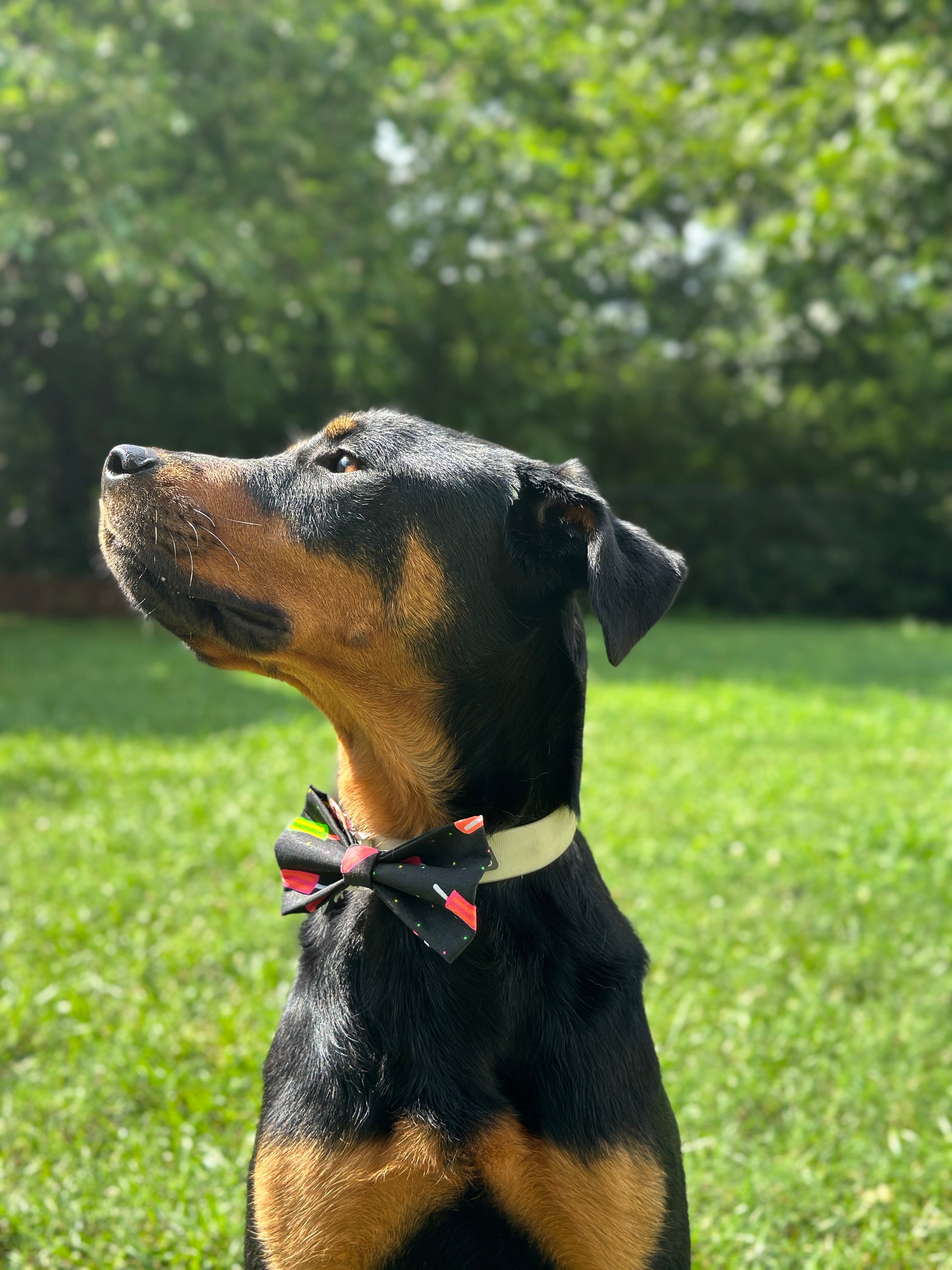 Pictured: Denali (55 lbs.) wearing a large bow tie