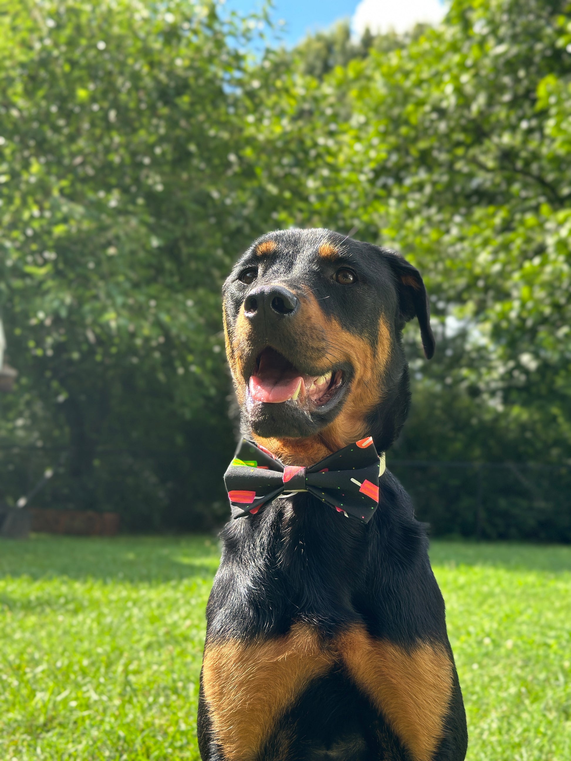 Pictured: Denali (55 lbs.) wearing a large bow tie