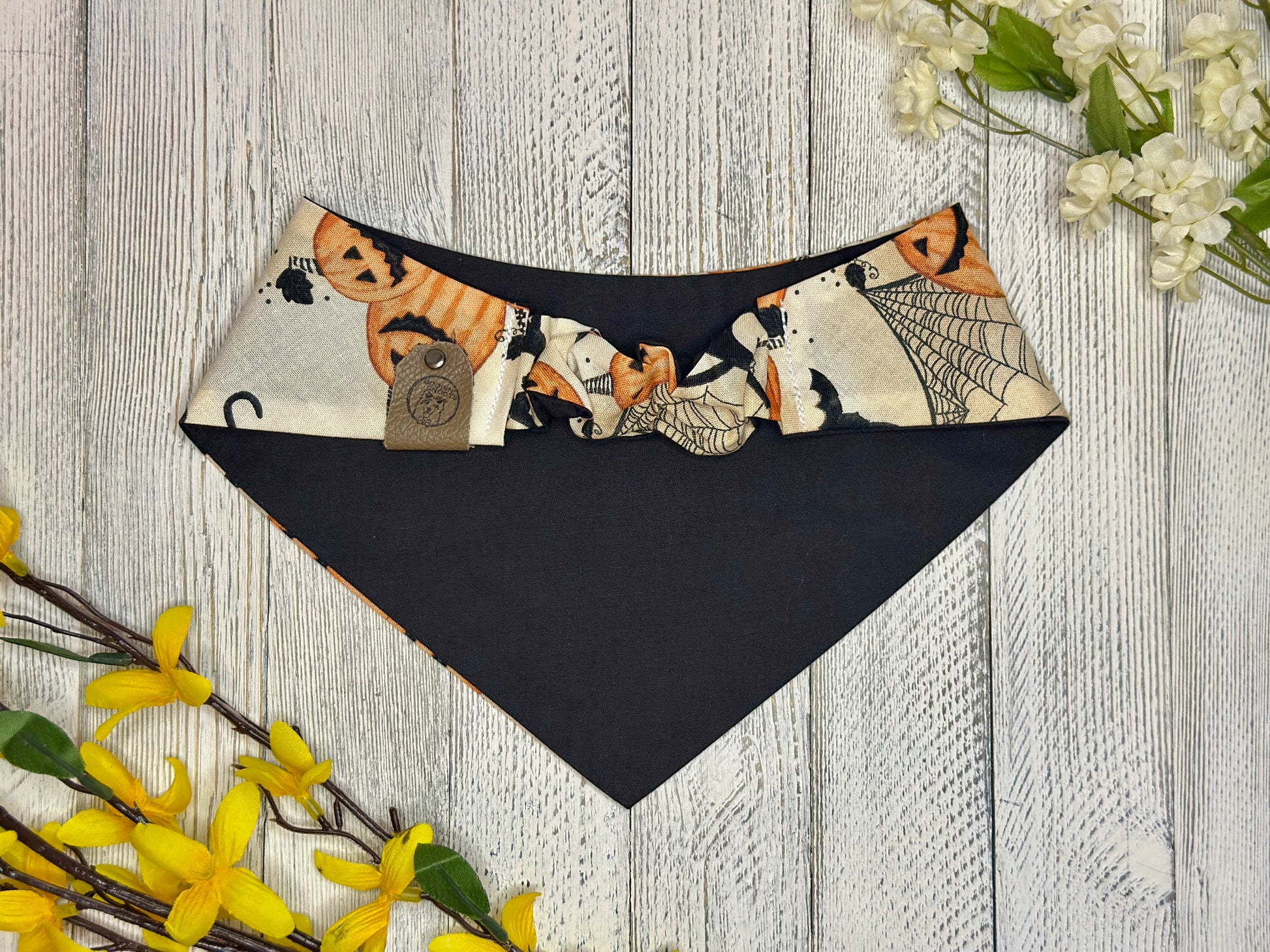 Our boo-tiful Pumpkins, Bats, and Black Cats scrunchie dog bandana is just spooky enough for your pup! Handcrafted from cozy cotton fabric, this howlin' good accessory features playful pumpkins, bats, and black cats. Perfect for the pup that loves to celebrate Halloween in style!
