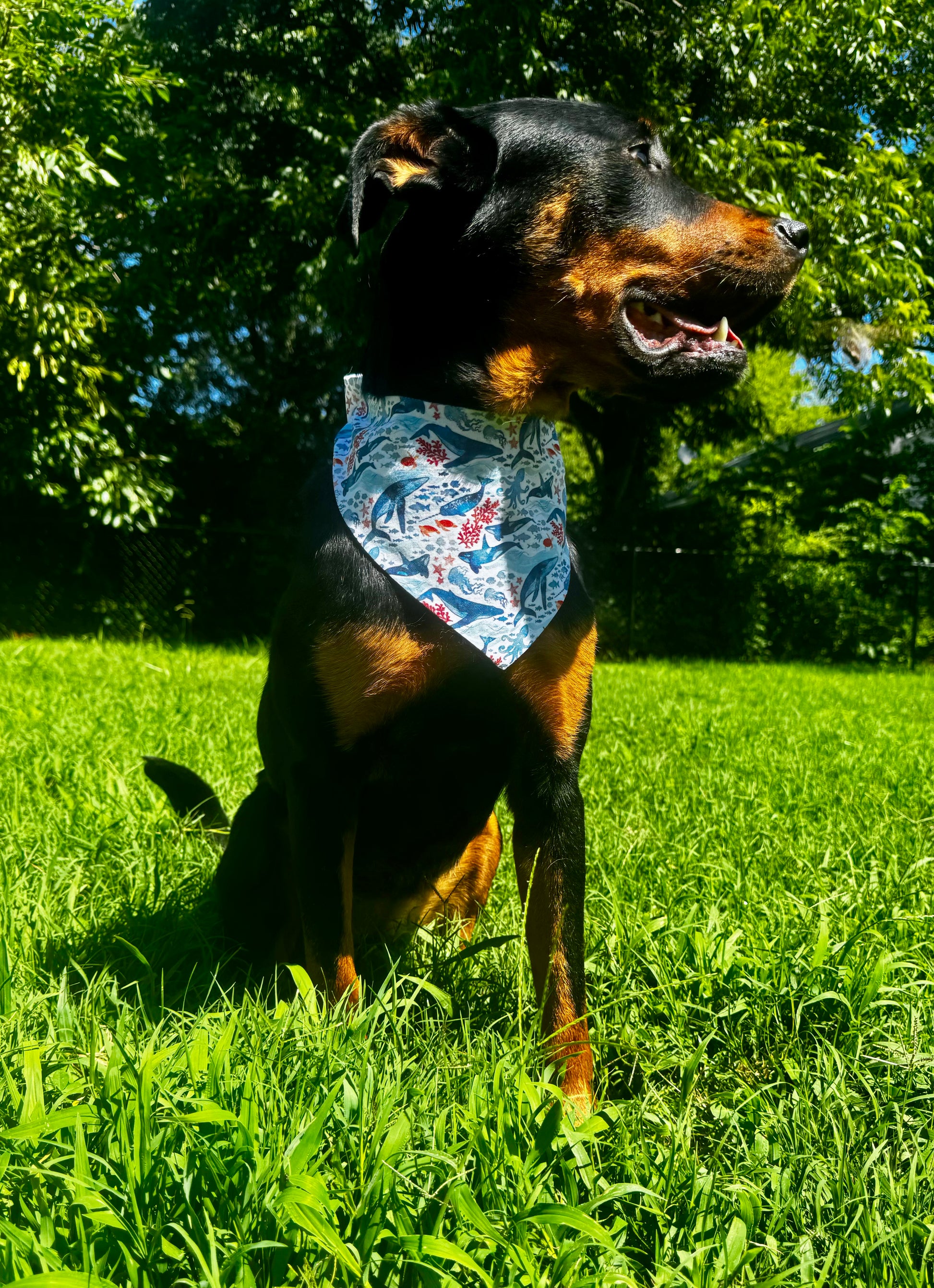 Make your pet the star of the sea with the Sea Creatures reversible bandana. Designed for easy slip-on wear (no tying or collar sliding needed). This bandana features stunning sea creatures like whales and jellyfish on one side and ocean waves on the other. Crafted from comfortable cotton, it ensures your furry friend stays cozy while looking irresistibly cute. Bring the magic of the ocean to your pet’s wardrobe today!